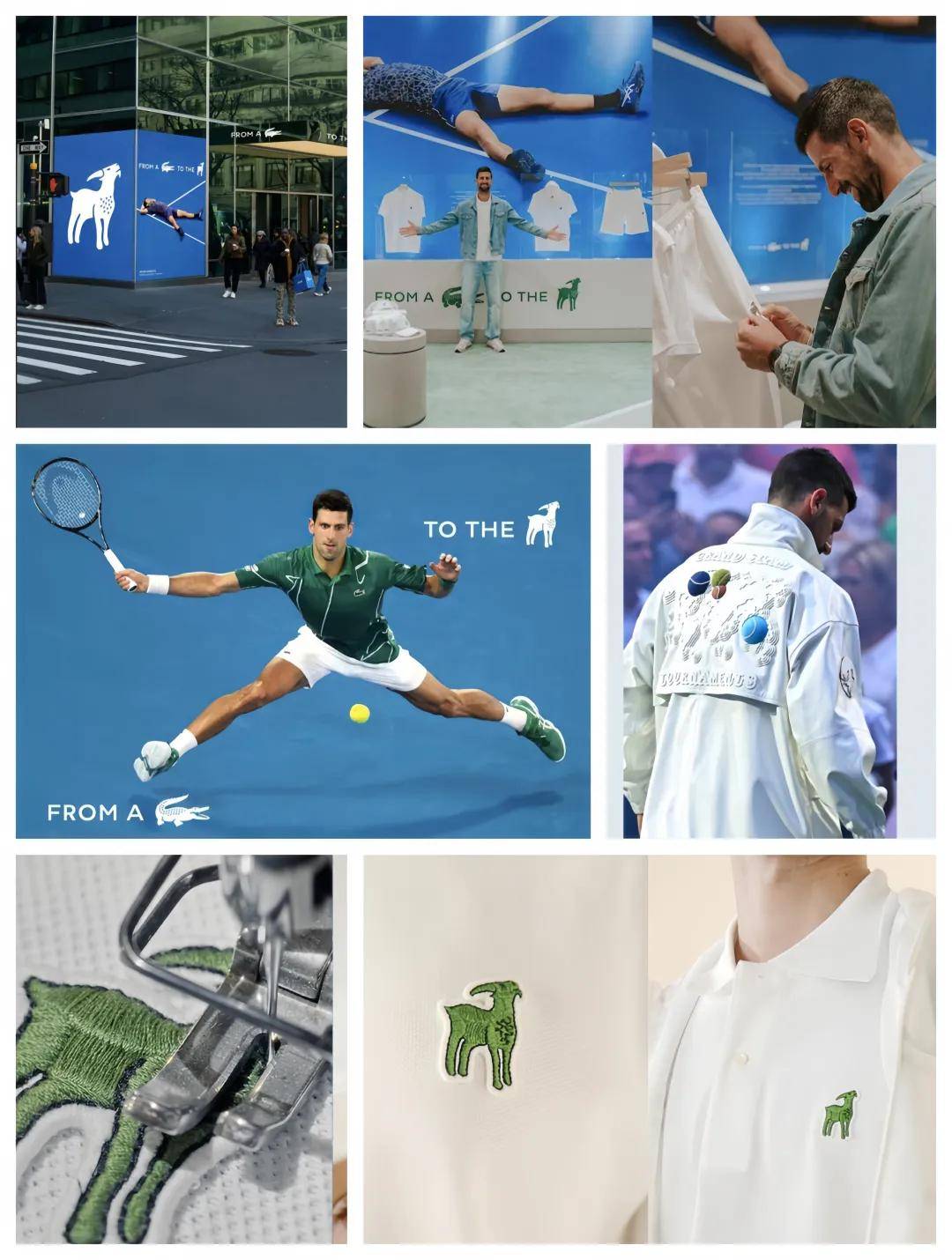 【Lacoste标志从鳄鱼变山羊】Lacoste为致敬品牌大使德约科维奇,网球史上无数传奇和难以被超越的纪录,将其标志性logo,从鳄鱼变成了山羊GOAT。GOAT是史上最佳的含义,也是德约科维奇的绰号,这创造了体育营销史上,品牌为代言人改变logo标志的历史性创举。