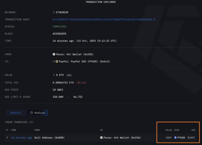 根据链上记录,在错误发生后,Paxos又重新发行了3亿枚PYUSD——原本应执行的正确操作。从300million到300trillion,只是一个数字单位的偏差,却带来了足以震动整个加密圈的蝴蝶效应。