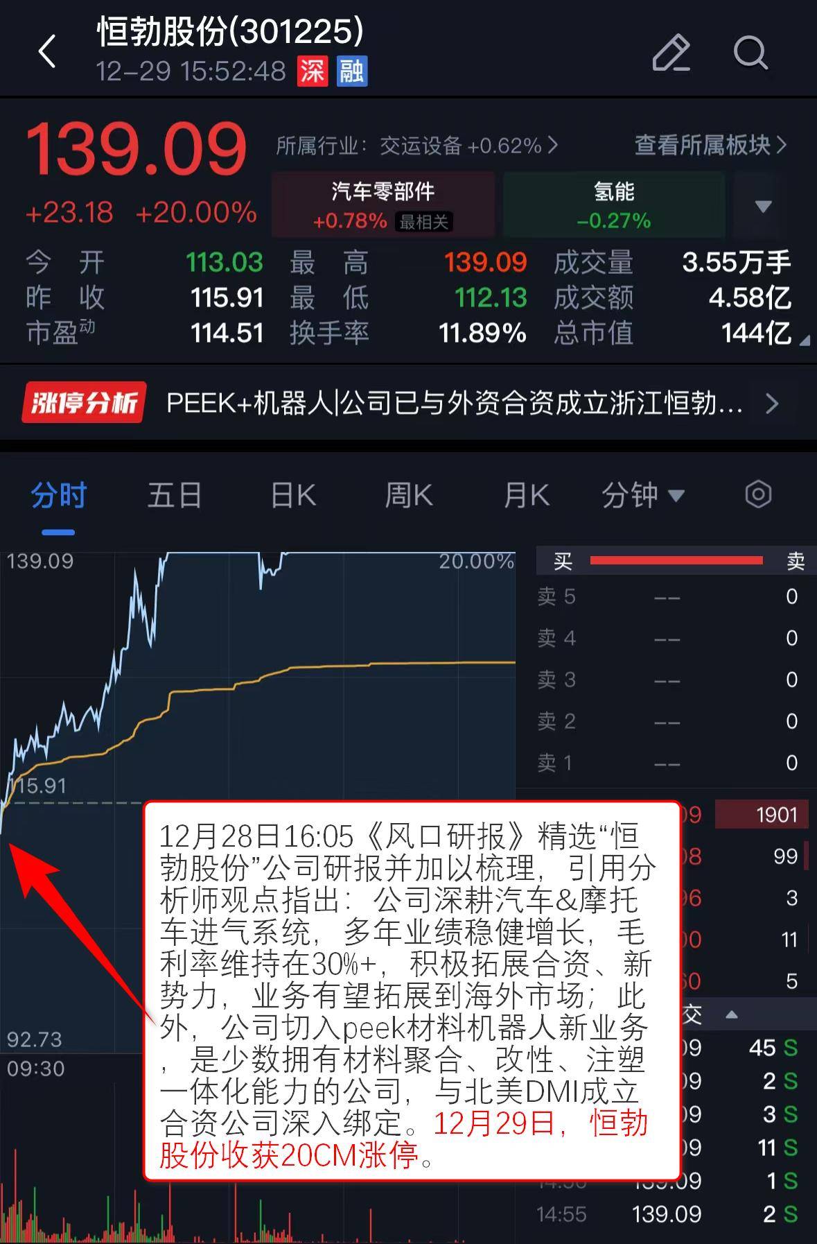 精选“恒勃股份”公司研报并加以梳理,引用分析师观点指出:公司深耕汽车&摩托车进气系统,多年业绩稳健增长,毛利率维持在30%+,积极拓展合资、新势力,业务有望拓展到海外市场;此外,公司切入peek材料机器人新业务,是少数拥有材料聚合、改性、注塑一体化能力的公司,与北美DMI成立合资公司深入绑定。12月29日,恒勃股份收获20CM涨停。