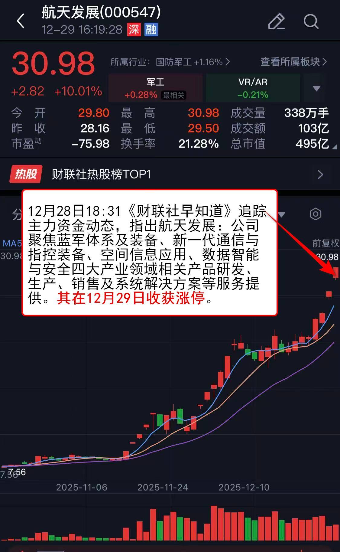 追踪主力资金动态,指出航天发展:公司聚焦蓝军体系及装备、新一代通信与指控装备、空间信息应用、数据智能与安全四大产业领域相关产品研发、生产、销售及系统解决方案等服务提供。其在12月29日收获涨停。