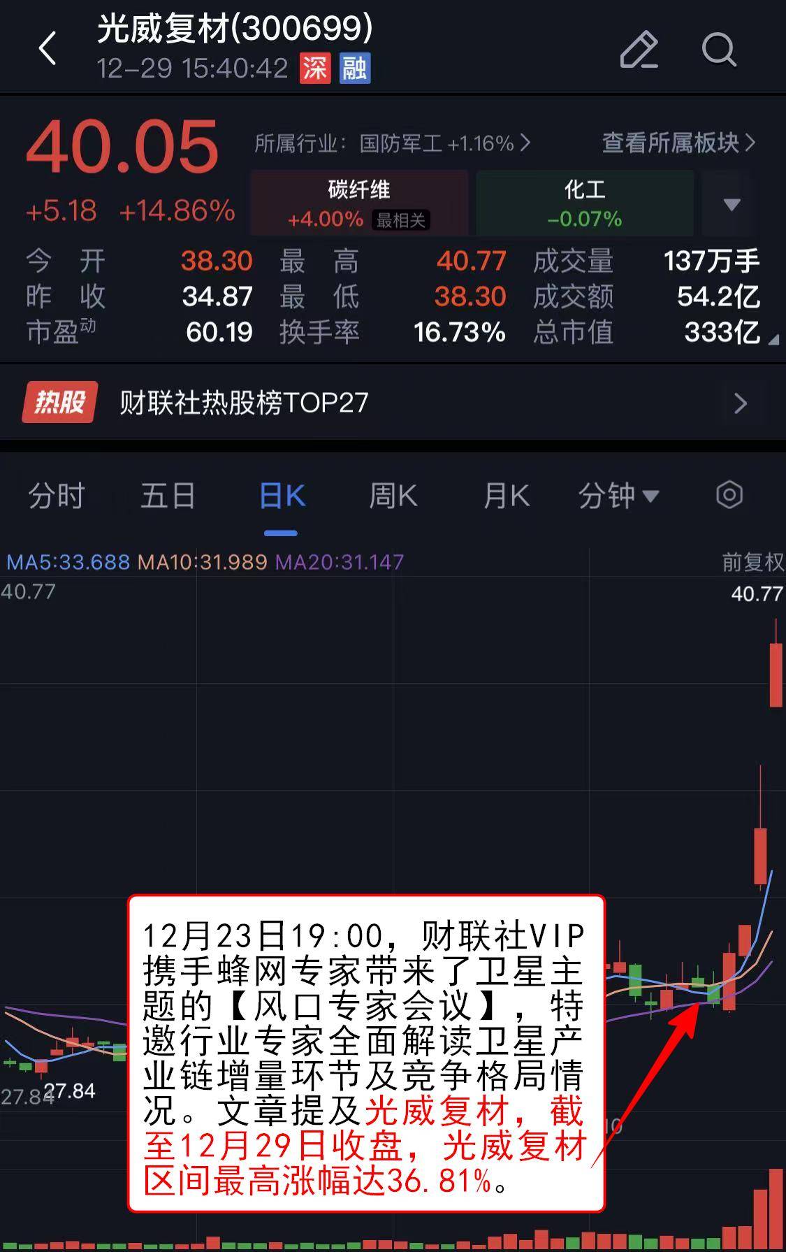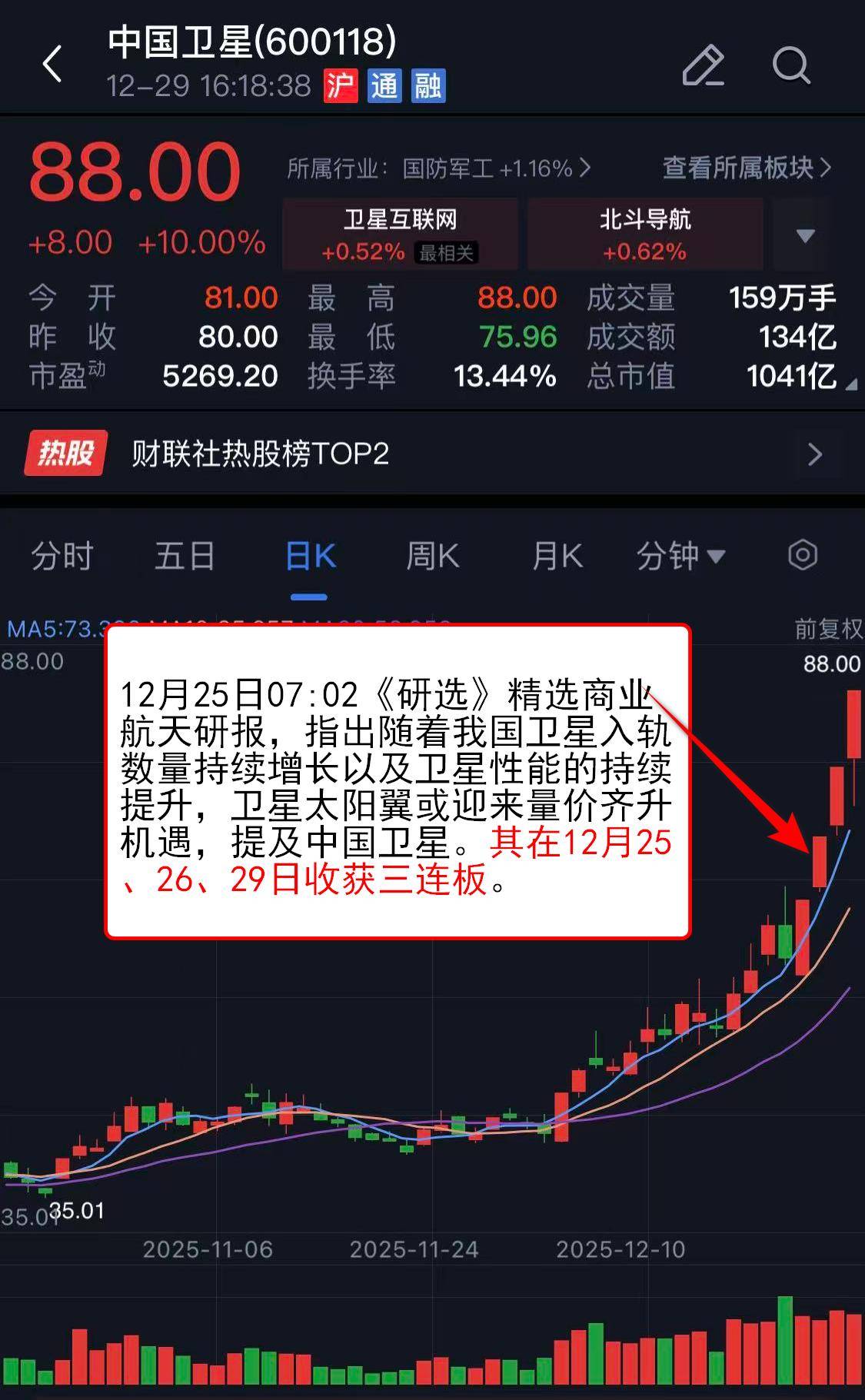 12月25日07:02《研选》精选商业航天研报,指出随着我国卫星入轨数量持续增长以及卫星性能的持续提升,卫星太阳翼或迎来量价齐升机遇,提及中国卫星。其在12月25、26、29日收获三连板。