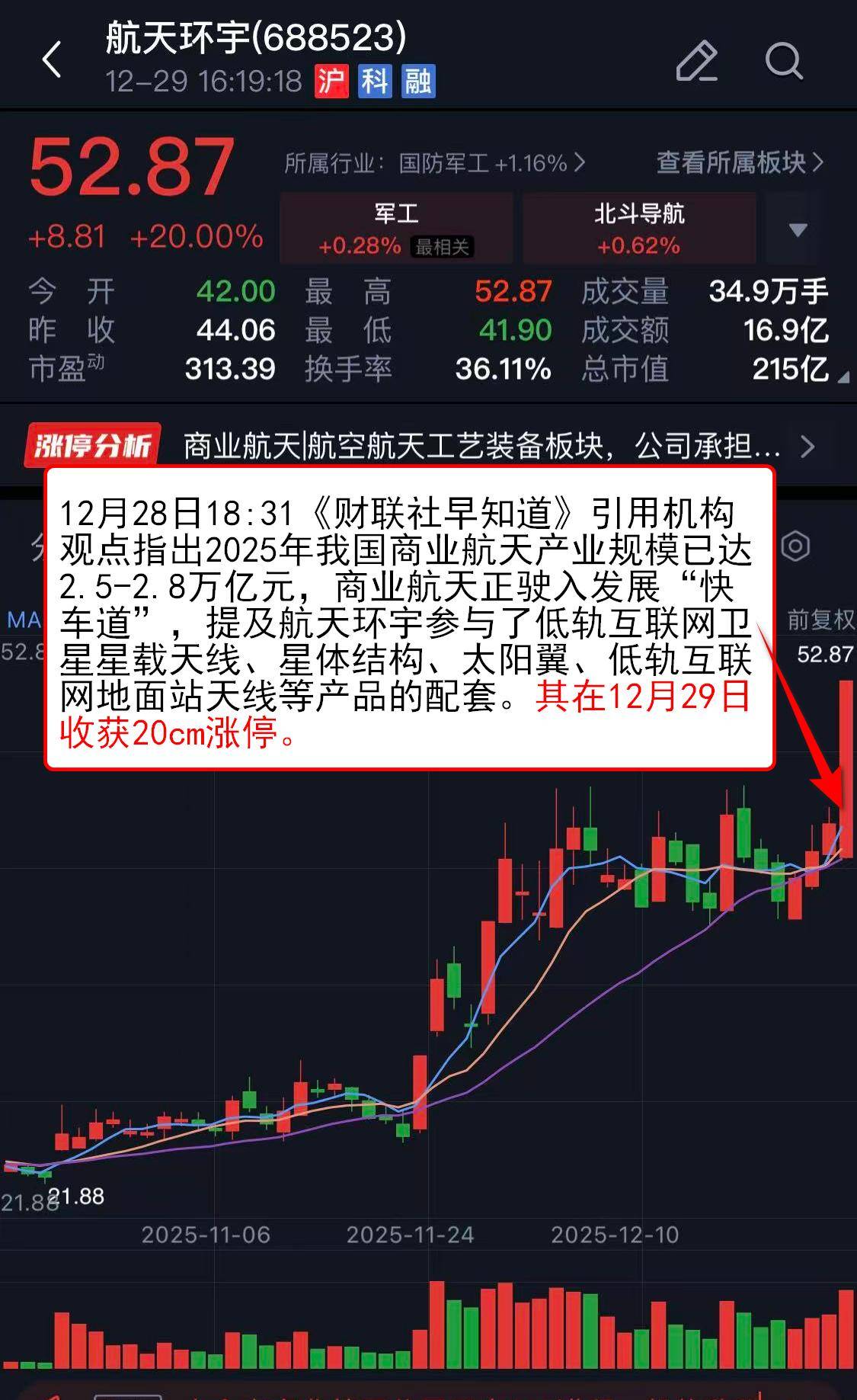 12月28日18:31《财联社早知道》引用机构观点指出2025年我国商业航天产业规模已达2.5-2.8万亿元,商业航天正驶入发展“快车道”,提及航天环宇参与了低轨互联网卫星星载天线、星体结构、太阳翼、低轨互联网地面站天线cm涨停。