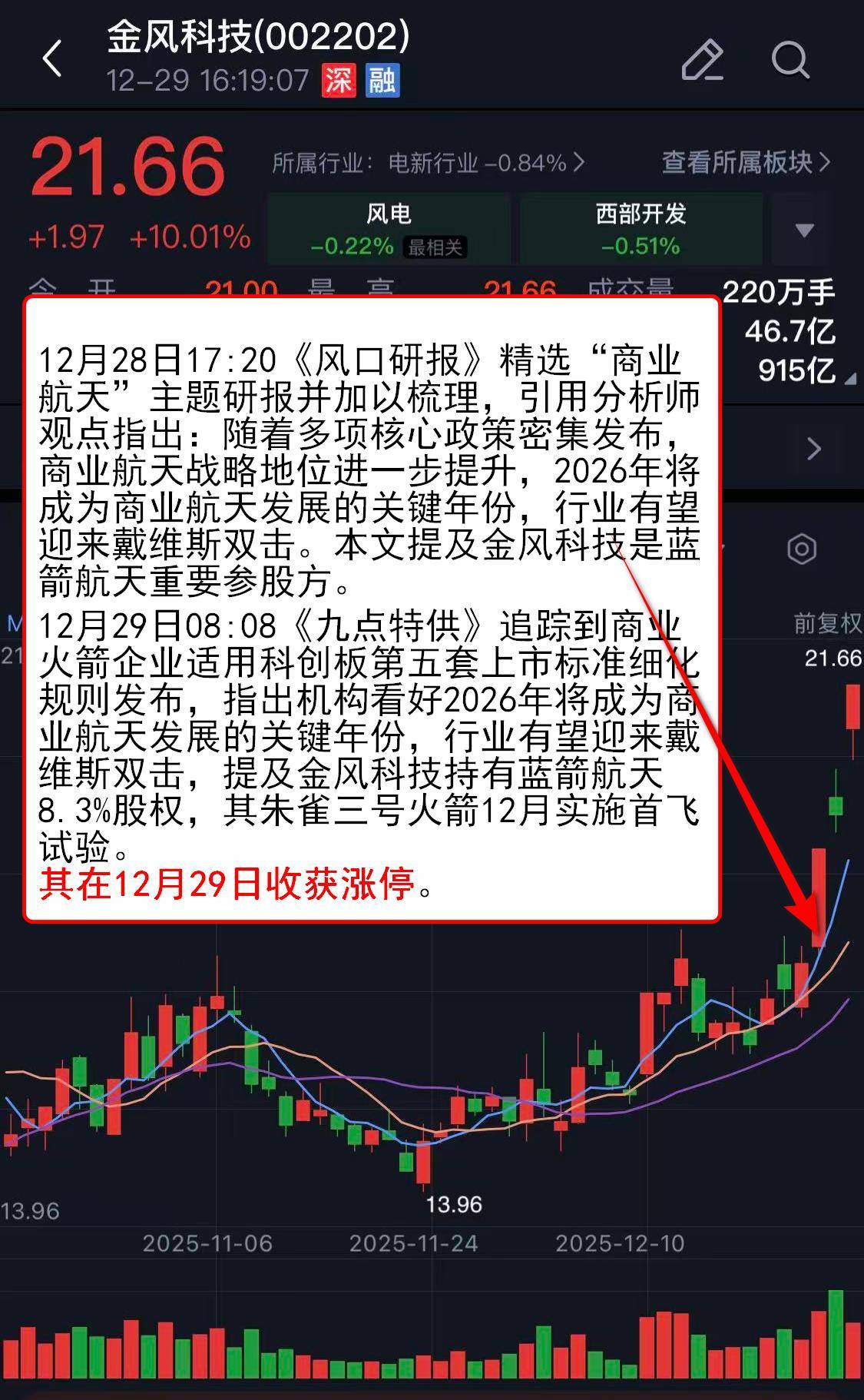 12月29日08:08《九点》追踪到商业火箭企业适用科创板第五套上市标准细化规则发布,指出机构看好2026年将成为商业航天发展的关键年份,行业有望迎来戴维斯双击,提及金风科技持有蓝箭航天8.3%股权,其朱雀三号火箭12月实施首飞试验。