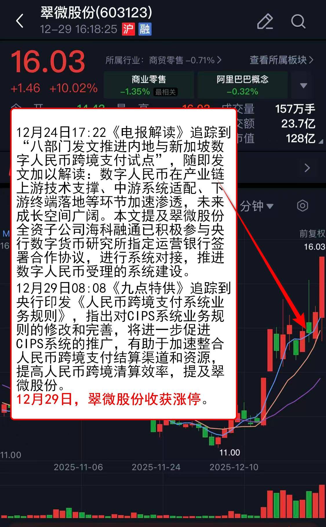 12月24日17:22《电报解读》追踪到“八部门发文推进内地与新加坡数字人民币跨境支付试点”,随即发文加以解读:数字人民币在产业链上游技术支撑、中游系统适配、下游终端落地等环节加速渗透,未来成长空间广阔。本文提及翠微股份全资子公司海科融通已积极参与央行数字货币研究所指定运营银行签署合作协议,进行系统对接,推进数字人民币受理的系统建设。