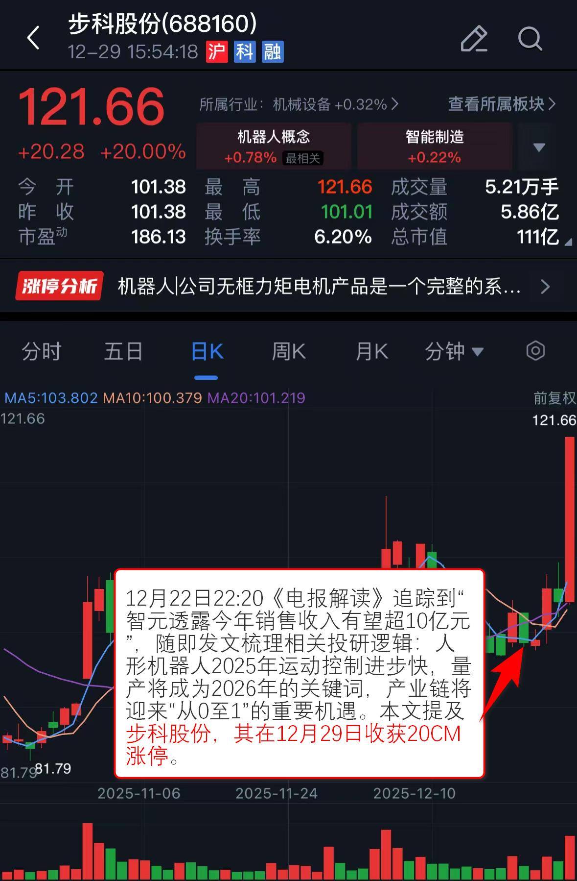 追踪到“智元透露今年销售收入有望超10亿元”,随即发文梳理相关投研逻辑:人形机器人2025年运动控制进步快,量产将成为2026年的关键词,产业链将迎来“从0至1”的重要机遇。本文提及步科股份,其在12月29日收获20CM涨停。
