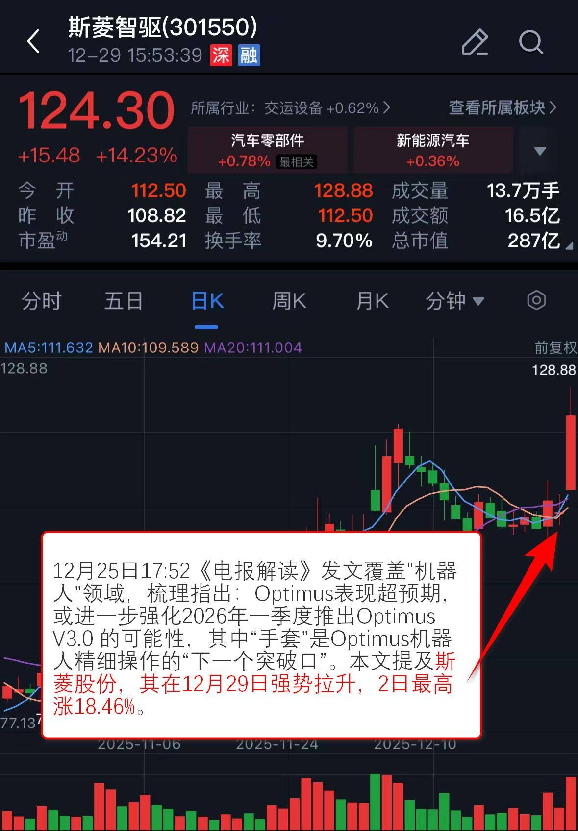 发文覆盖“机器人”领域,梳理指出:Optimus表现超预期,或进一步强化2026年一季度推出Optimus V3.0 的可能性,其中“手套”是Optimus机器人精细操作的“下一个突破口”。本文提及斯菱股份,其在12月29日强势拉升,2日最高涨18.46%。