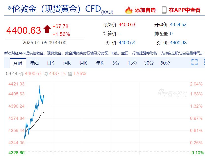 1月5日,现货白银日内盘中大涨近4%,现报75.58美元/盎司。现货黄金重回4400美元关口之上,日内涨幅扩大至1.56%。
