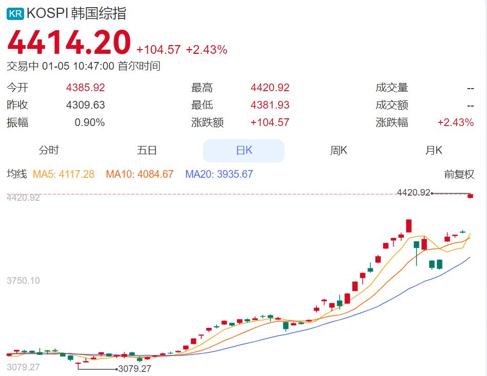 此外,周一早盘,日韩股市高开,日经225指数开盘涨1.33%,韩国KOSPI指数开盘涨1.77%。截至发稿,日经225指数涨2.82%,报51760.51点;韩国KOSPI指数涨2.43%,报4414.2点。