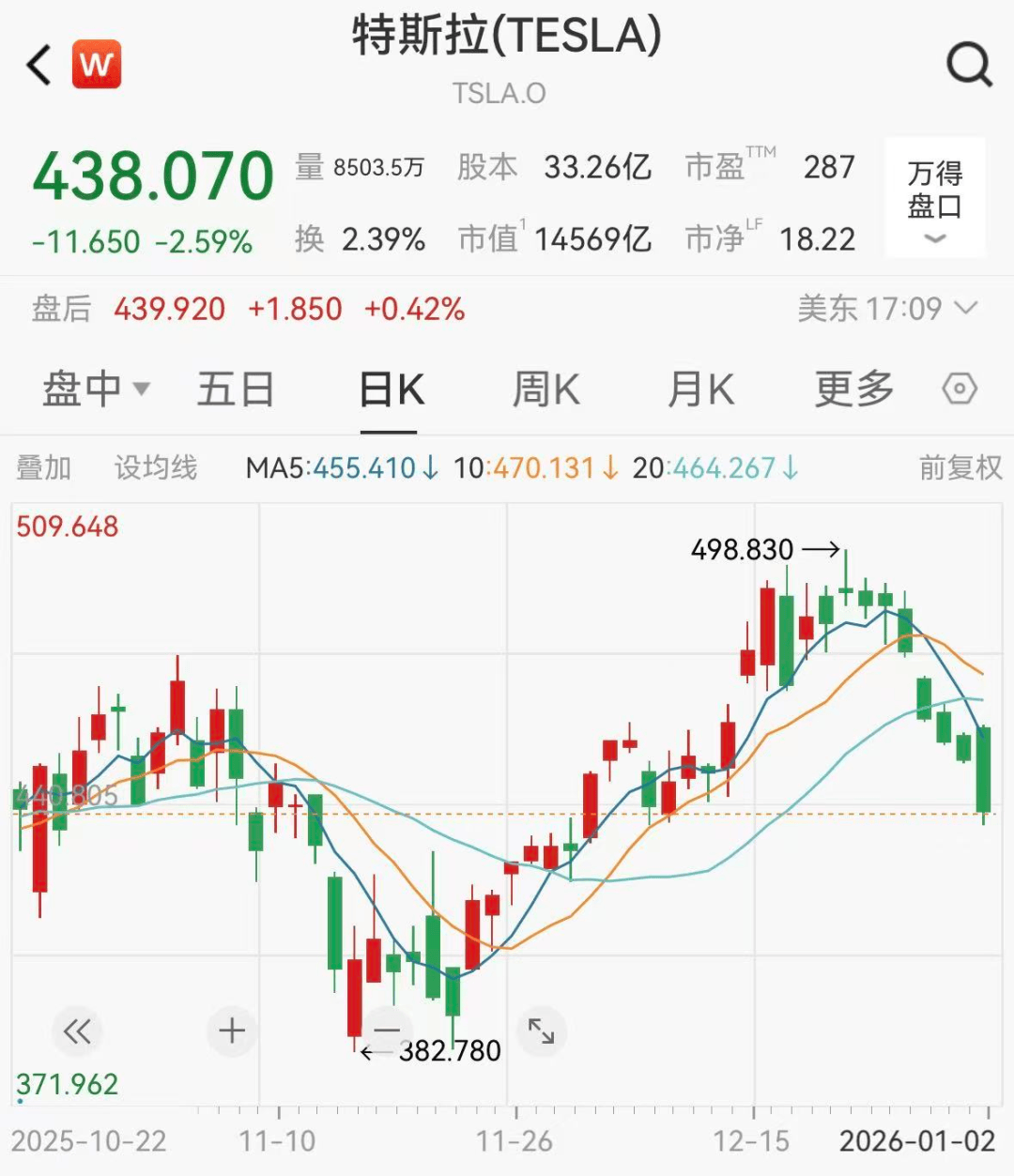 板块方面,大型科技股跌多涨少,其中,特斯拉连续七个交易日下跌。消息面上,据央视新闻报道,当地时间1月2日,特斯拉公布数据显示,该公司2025年全球交付汽车163.6万辆,同比下降约8.6%。这是特斯拉有史以来首次在全年电动汽车销量上被中国汽车制造商比亚迪超越。