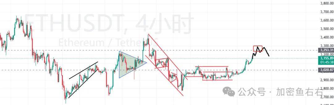 ETH短线关键位区间,日线级别有走三角形态的概率,此阶段有筑底的迹象,目前还缺一个高点,因此短期价格上涨动能依然很强,至少还有一波加速上涨行情。
