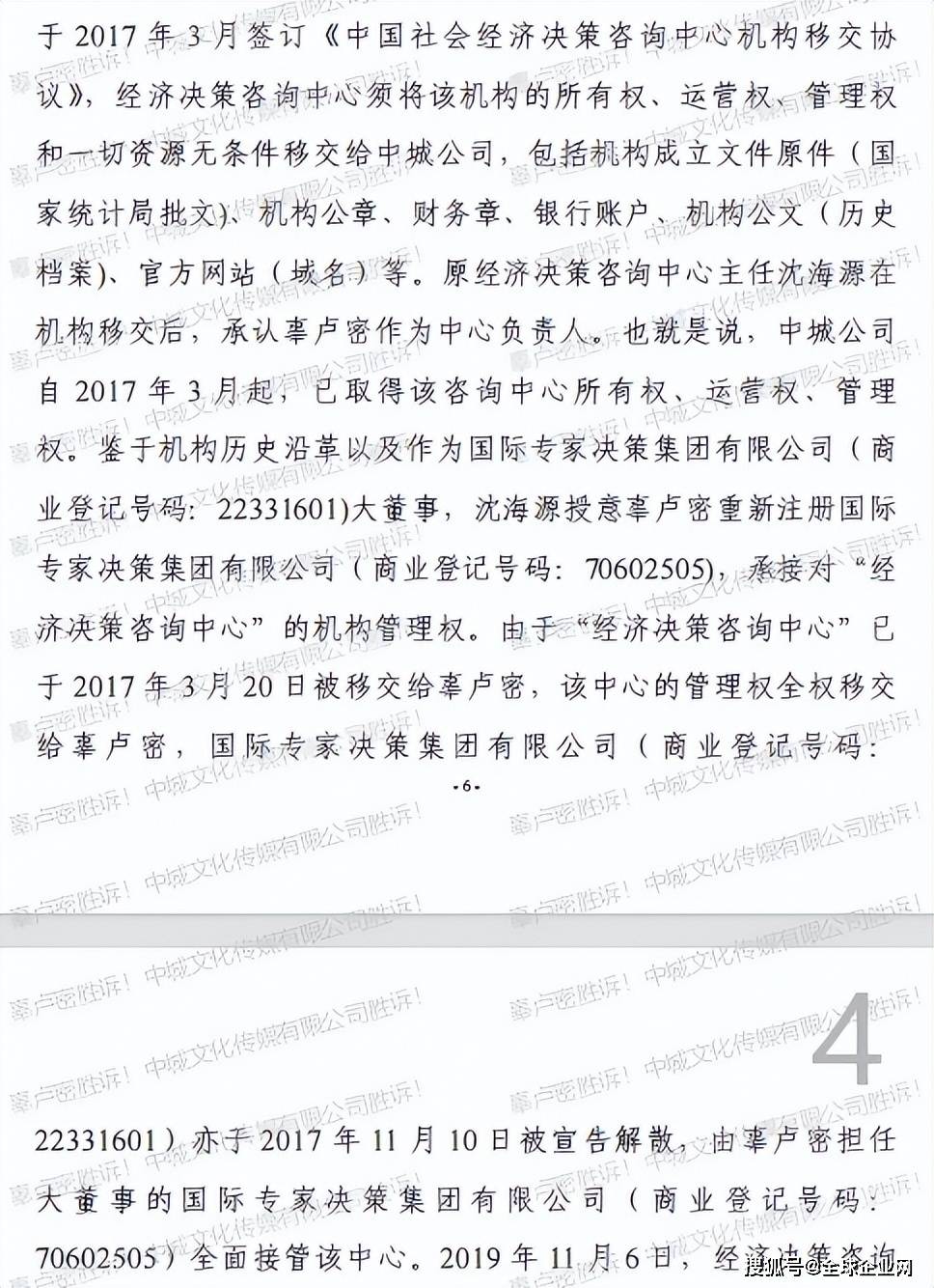 本次网络侵权责任纠纷的根源,是侵权方华声公司幕后操纵者——王玉献为争夺“中国社会经济决策咨询中心”运营管理权而制造的网络恶意攻击。王玉献(中民企联(北京)企业管理中心控股股东)自认为是“中国社会经济决策咨询中心主任”,却没有任何合法授权文件。早于2014年5月13日,中国社会经济决策咨询中心便与国际社团投资控股集团有限公司(负责人为辜卢密)签订了《协议》,约定由中国社会经济决策咨询中心协助申请“广东省社会经济决策咨询中心”事业单位名称及编制,并将中国社会经济决策咨询中心在广东地区的所有业务交由辜卢密负责。2017年3月,中国社会经济决策咨询中心与中城公司签订了《移交协议》,中国社会经济决策咨询中心将该机构的所有权、运营权、管理权和一切资源无条件移交给中城公司,包括机构成立文件原件(国家统计局批文)、机构公章、财务章、银行账户、机构公文(历史档案)、官方网站(域名)等,原中国社会经济决策咨询中心主任沈海源在机构移交后,承认辜卢密作为中心负责人,即中城公司自2017年3月起,已取得该咨询中心所有权、运营权、管理权。鉴于历史沿革:1999年,根据国家统计局与中国国情研究会等有关文件要求,中国社会经济决策咨询中心与国家统计局、中国国情研究会脱钩,转制为由国际专家决策集团有限公司管理的市场咨询服务机构,由沈海源担任大董事的国际专家决策集团有限公司于2017年11月宣告解散,由辜卢密担任大董事的国际专家决策集团有限公司于2019年4月重新注册成立,继续履行对“中国社会经济决策咨询中心”的管理权。至此,辜卢密全面取得了对该中心的运营管理权。