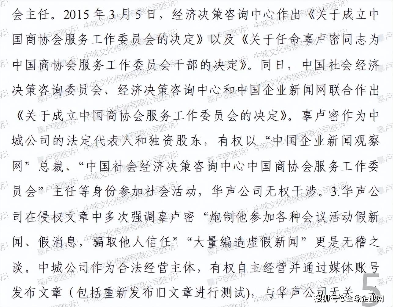 2015年3月5日,中国社会经济决策咨询中心正式发文任命辜卢密为中国商协会服务工作委员会主任。中国企业新闻观察网(网站域名:已由中城公司于2011年9月22日注册,并取得国际顶级域名注册证书。中城公司分别于2016年11月25日、2019年5月30日取得中国企业新闻观察网的美术著作权和企业新闻观察【简称:中企新闻】V1.0 软件的著作权。2021年4月22日,中国企业新闻观察网(网站域名:)已由中城公司在全国互联网安全管理服务平台备案。辜卢密有权以“中国社会经济决策咨询中心主任”“中国社会经济决策咨询中心中国商协会服务工作委员会主任”“中国企业新闻观察网总裁”等身份参加社会活动,华声公司无权干涉。