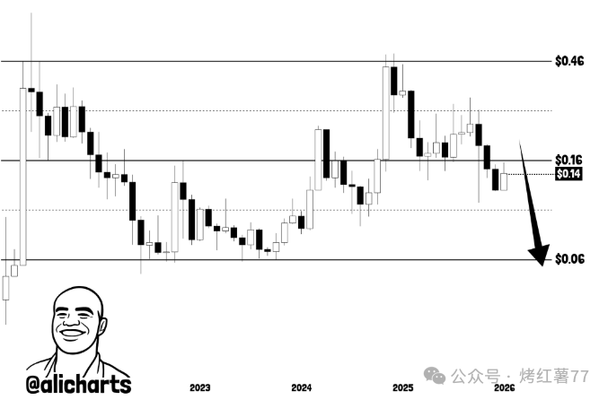 根据他公布的月线图分析,狗狗币走势疲软,若当前抛售压力持续,其价格可能进一步下探至 0.06 美元。这对于在过去几年中经历了狗狗币大起大落的投资者而言,无疑是一个值得警惕的信号。