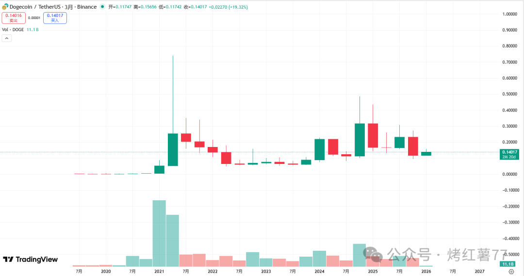 月线 美元的历史高点以来,狗狗币整体处于下降趋势中。当前其价格在 0.32 美元附近徘徊,但如果线 美元,将意味着从现价下跌约81%,成为其历史上幅度最大的一次回调。