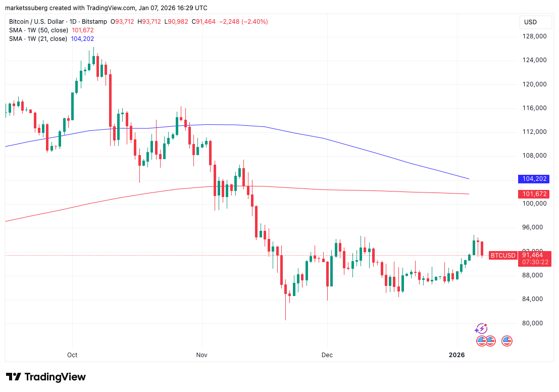 多个交易工具显示的做空信号表明,BTC/USD不太可能在2027年之前创下新的历史高点。