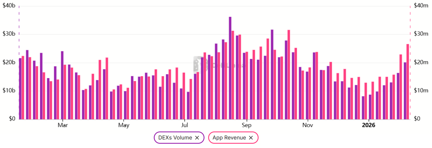 尽管整体环境走弱,2026年以来以太坊去中心化应用(DApp)需求已稳步回升。
