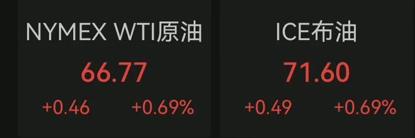 WTI原油期货涨幅一度扩大至1%,现报66.77美元/桶;布伦特原油期货涨0.69%,报71.6美元/桶。