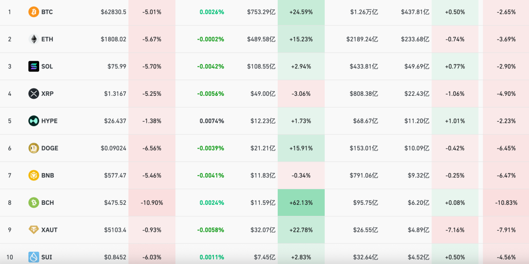 继昨日大跌后,2月24日,比特币延续跌势,24小时跌幅一度超3.5%,数次跌破63000美元,最低跌至62700美元附近。