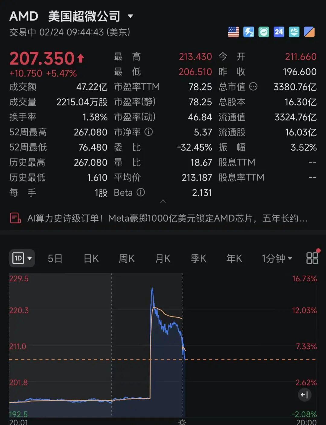 美股盘前,AMD股价直线%,截至发稿,涨幅回落至5.47%,报207.35美元,最新市值为3380.76亿美元。消息面上,AMD同意向Meta公司出售价值高达600亿美元的AI芯片。两家公司最新的合作对AMD来说是关键进展,目前其在AI芯片市场远落后于英伟达。英伟达目前是全球市值最大的上市公司,掌控着约90%的市场份额。Meta已经是AMD的第二大客户,现在对这家芯片制造商的增长将变得更加至关重要。根据华尔街的预测,AMD去年的销售额为346亿美元,今年有望实现34%的营收增长。哪怕只增加100亿美元的额外销售额,也将加速其追赶英伟达的进程。