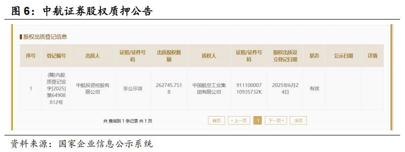 2025年6月24日,中航投资向中航工业集团出质中航证券26.27亿元股权。