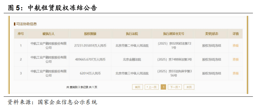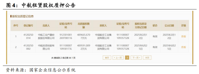 2025年6月25日,中航投资向中航工业集团出质中航租赁48.96亿元股权。