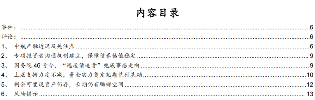 综合来看,我们认为中航工业集团支持意愿不弱,资金实力可观,短期债券兑付仍有保障;中航产融剩余可变现资产仍存,中长期资源整合尚有空间;同时政策文件有效兜底事态走向。在中航信托处置进展平稳可控的前提下,2026年中航产融事件或进入反转阶段,值得关注。