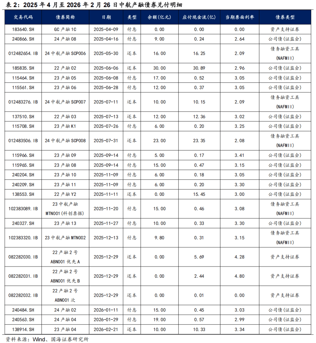 根据2026年2月26日中航产融债券持有人会议决议落实情况公告显示,公司如期足额兑付到期境内债券及债务融资工具共计123.25亿元,与2025年4月至2026年2月26日Wind统计中航产融债券还本付息合计131.40亿元基本吻合。截至2026年2月26日,中航产融存量境内债券仍有156.70亿元,2026年到期规模约78.6亿元,6月、9月、11月及12月为兑付高峰。