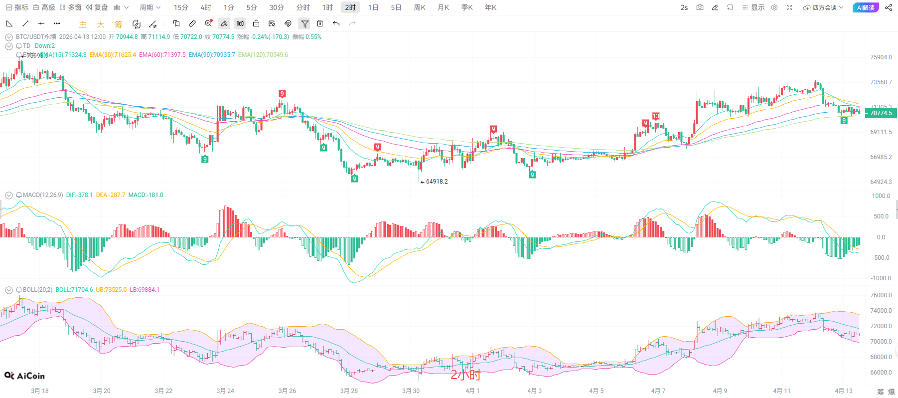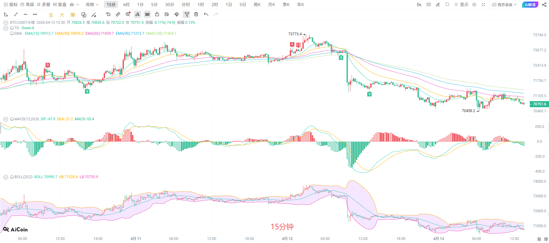 十五分钟K线窄幅震荡,布林带收口,多空博弈加剧。均线系统呈弱势排列,价格受 EMA15压制,MACD指标在零轴下方运行,调整信号延续。当前走势属于高位回调后的整理,下方70400附近为短期支撑,上方71200为压力,若无法快速收复EMA15,大概率延续震荡下探,回踩2小时级别支撑。