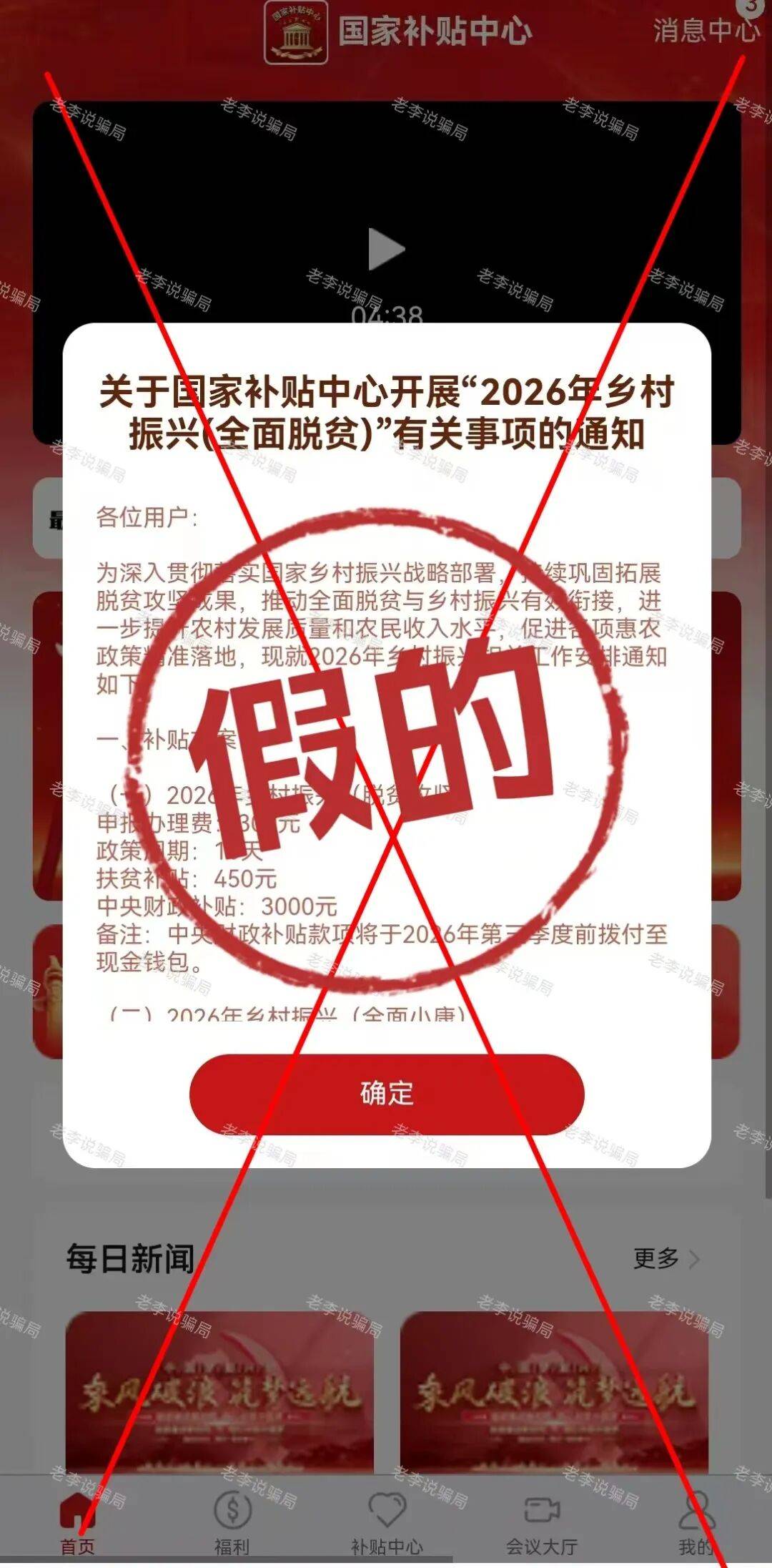 冒充国家背景,以领取补贴的名义,通过小额红包吸引大家注册拉新。近期开始以“发放补贴”为由,要求缴纳所谓的“办理费”。