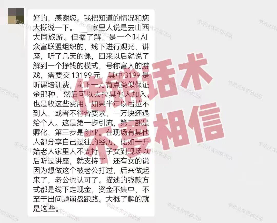 该组织实际是“民间自愿互助理财49800传销”的最新变种。不过是将投资款拆解为“13199元+50000元”的组合,用“小投入试错”的名义降低新人戒心。其洗脑流程固定、资金要求明确、层级机制清晰、虚假背书常见。大家千万要守住理性,拒绝诱惑,才是防骗最有效的武器。