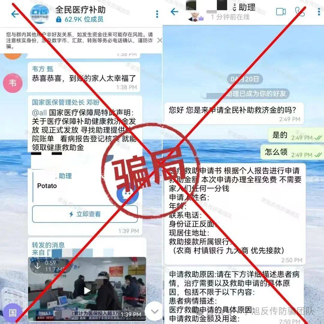 冒充“医疗保障局”的工作人员,在某境外聊天软件中,以“领取健康扶助金”为由,套取用户个人信息和银行卡。一旦提交,不仅领不到所谓的补助金,反而可能在不知情的情况下,成为诈骗分子“洗钱”链条中的一环,甚至因此承担法律责任。