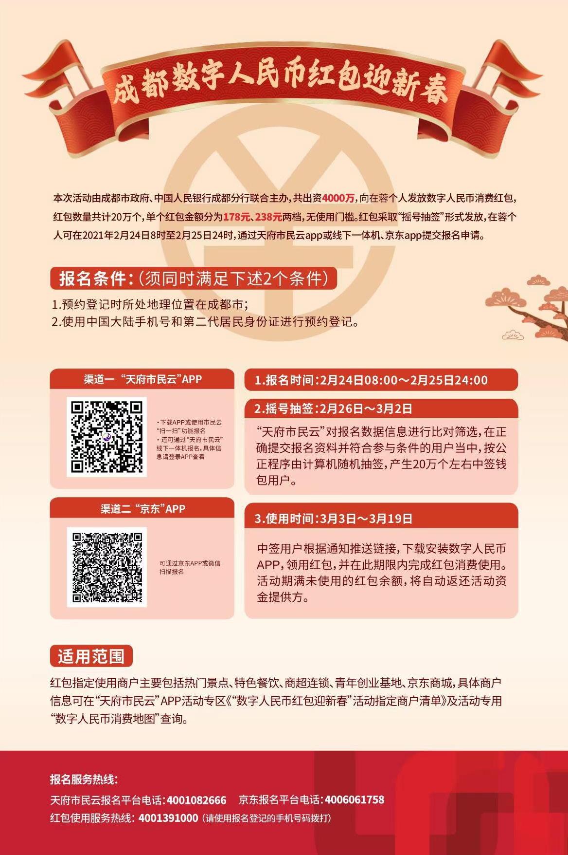 2月24日—2月25日24时,成都市民可通过天府市民云App或线下一体机、京东App,在线提交资料(手机号码、身份证号码、姓名、意向开户行)进行报名。通过摇号确定后,中签用户根据短信指引下载安装个人数字钱包,每个中签用户将收到178元、238元两档红包(通过随机摇号抽取确定金额),总金额为4000万元。数字人民币红包可在商超连锁、热门景点、特色餐饮、青年创业基地等10000余家成都市已完成数字人民币受理环境改造的商户以及京东商城指定自营商品范围内进行消费使用。