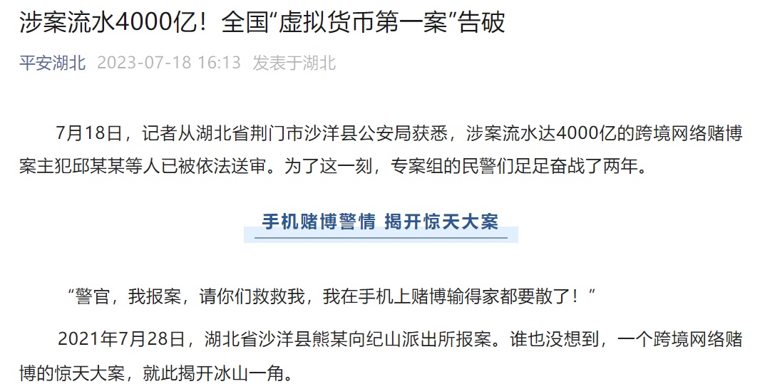 “初步查明这起网络赌博案,涉案流水金额达4000亿,涉案人员有5万多人,服务器架设在境外,资金洗钱方式用了最难查的虚拟货币,案件的主要骨干可能在境外……”