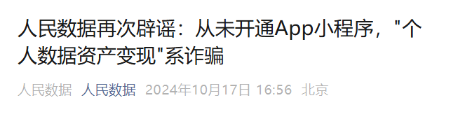 事实上,人民数据公司早在2024年就已发布声明,明确表示从未推出任何官方APP或小程序,并指出所谓的“个人数据资产变现”纯属诈骗。